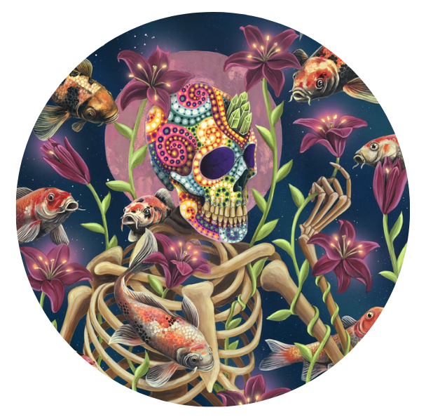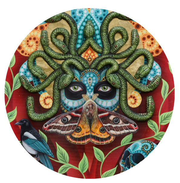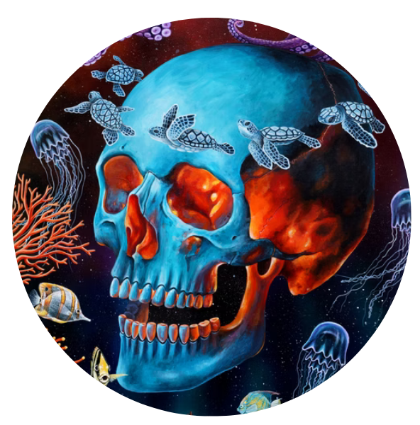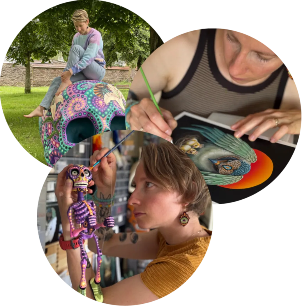 I'm a visual artist based in Rennes. Immersed in a creative environment from an early age, I developed a distinctive artistic universe, instantly recognizable for its vibrant colors and organic motifs. My hybrid practice blends painting, sculpture, and customization, while exploring a wide range of techniques and materials, sometimes enhanced by effects reactive to black light.